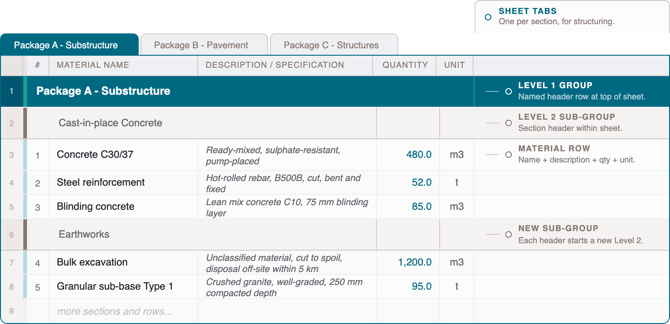 - Use consistent unit labelling throughout the file. Mixed units for the same material type across rows will require manual correction after extraction.